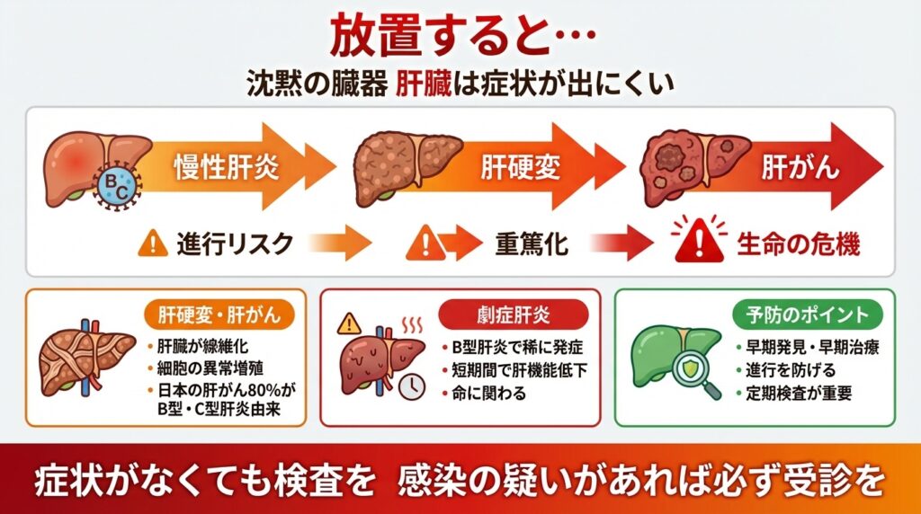 沈黙の臓器と言われる肝臓は、炎症が起きても痛みなどの症状が出にくく、気づかないうちに病状が進行してしまうことがあります。B型・C型肝炎ウイルスに感染したまま治療を受けずに放置すると、次のような重大なリスクがあります。