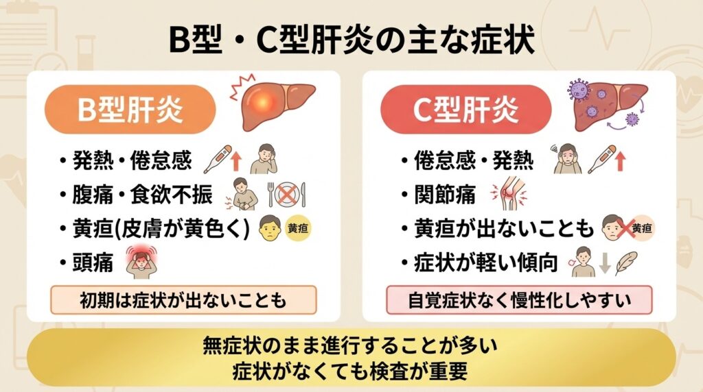 B型肝炎と似た症状(倦怠感、発熱、関節の痛み等)が出ることがありますが、黄疸が出ないことも多く、症状が軽い傾向があります。特にC型肝炎は自覚症状がないまま慢性化しやすいことが特徴です。B型・C型肝炎ともに無症状のまま進行することが少なくないため、症状がなくても注意が必要です。